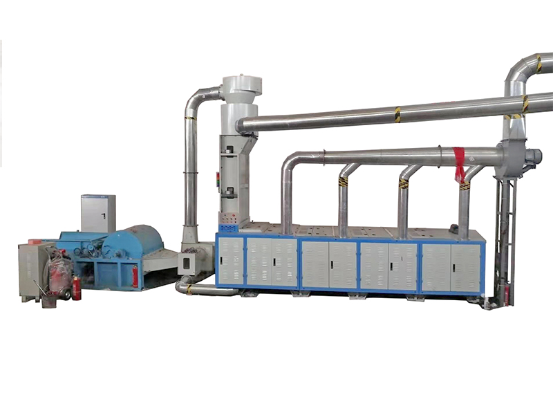 由兩個(gè)表面裝有角釘和針齒的機(jī)件相對(duì)運(yùn)動(dòng),對(duì)原料中的纖維塊進(jìn)行撕扯、松解。棉箱給棉機(jī)中的扯松部分。圖中角釘簾由裝有角釘?shù)哪景暨B接而成。纖維塊隨角釘簾向上運(yùn)動(dòng),與帶有角釘?shù)膱A筒形均棉羅拉相遇。由于角釘簾和均棉羅拉間隔開(kāi)的距離很小,纖維塊受到角釘抓取并撕扯而獲得松解。此時(shí)一部分扯松的纖維原料隨角釘簾輸出機(jī)外,另一部分則被均棉羅拉所擊落,然后再由角釘簾帶回二者之間,進(jìn)行反復(fù)扯松。在扯松過(guò)程中,纖維相互間發(fā)生一定的位移,纖維塊的密度降低,纖維與雜質(zhì)間的聯(lián)系減弱,一些粘附性小的雜質(zhì)被分離開(kāi)。